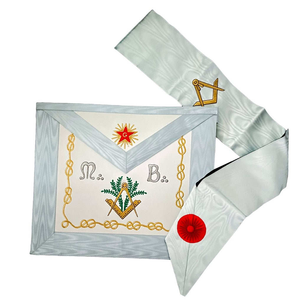 Esse Magnífico avental maçônico de Mestre é bordado à mão e decorado com um fronteira em fita vermelha e bordado feito à mão. Ele é adornado com oEstrela extravagante com a letra G, de Amor lagos, do Cartas M.B. e doQuadrado e bússola.
