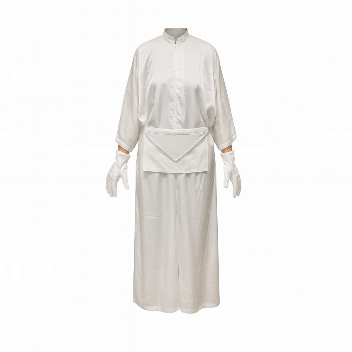 Vestido branco tradicional do Grand Female Lodge of Memphis-Misraïm em tecido inacessível de uma qualidade muito boa, com um pequeno passe de "oficial", entregue com um avental de aprendizes em couro de imitação e um par de luvas.