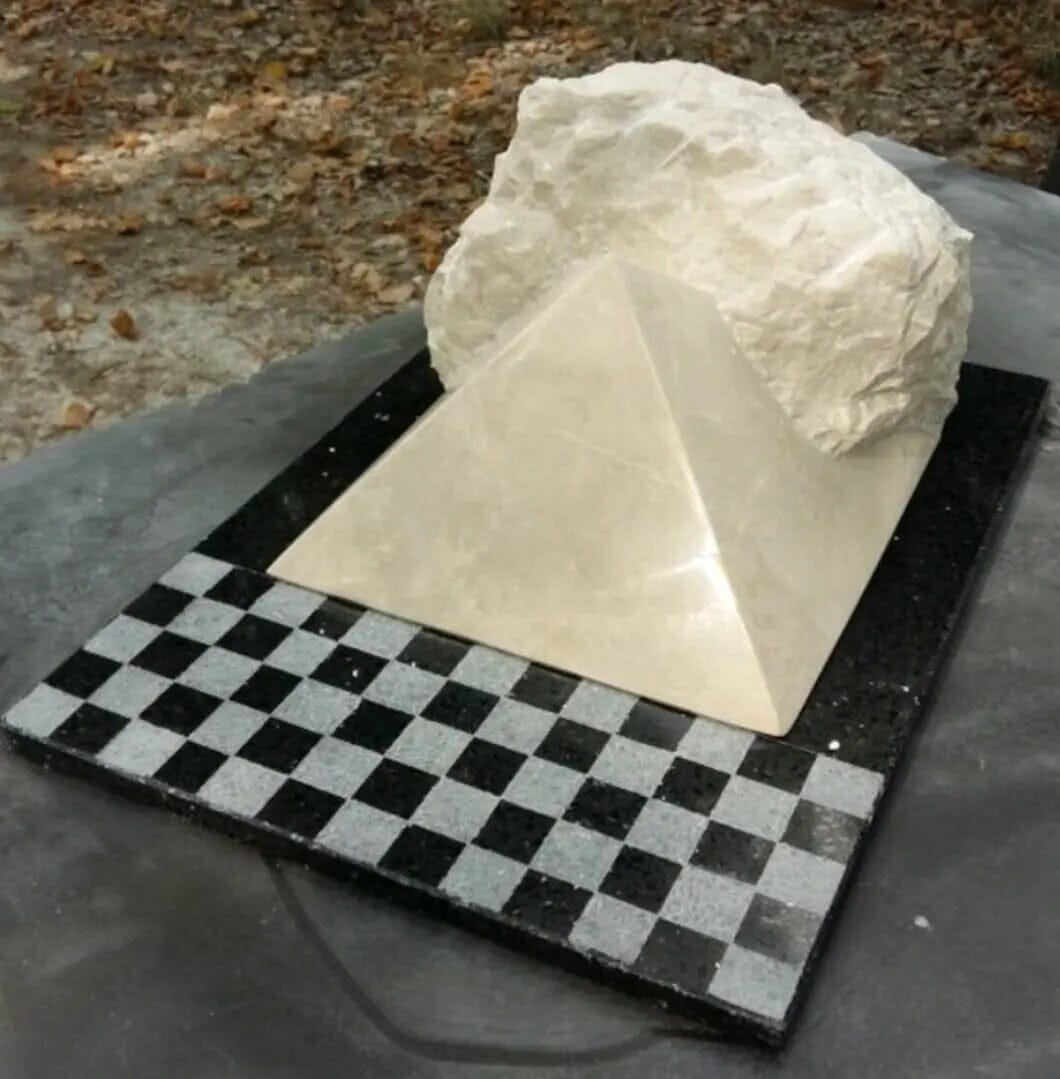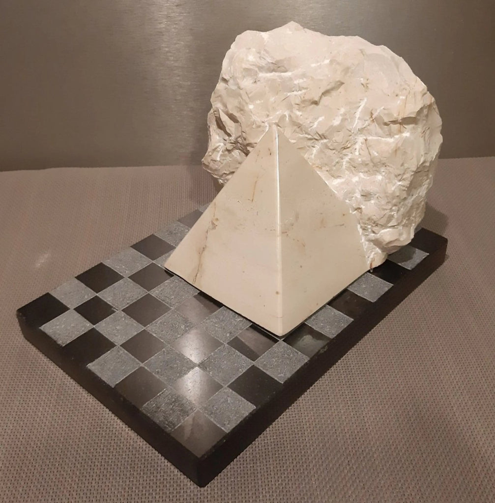 - Uma escultura "pirâmide" em calcário bege.
