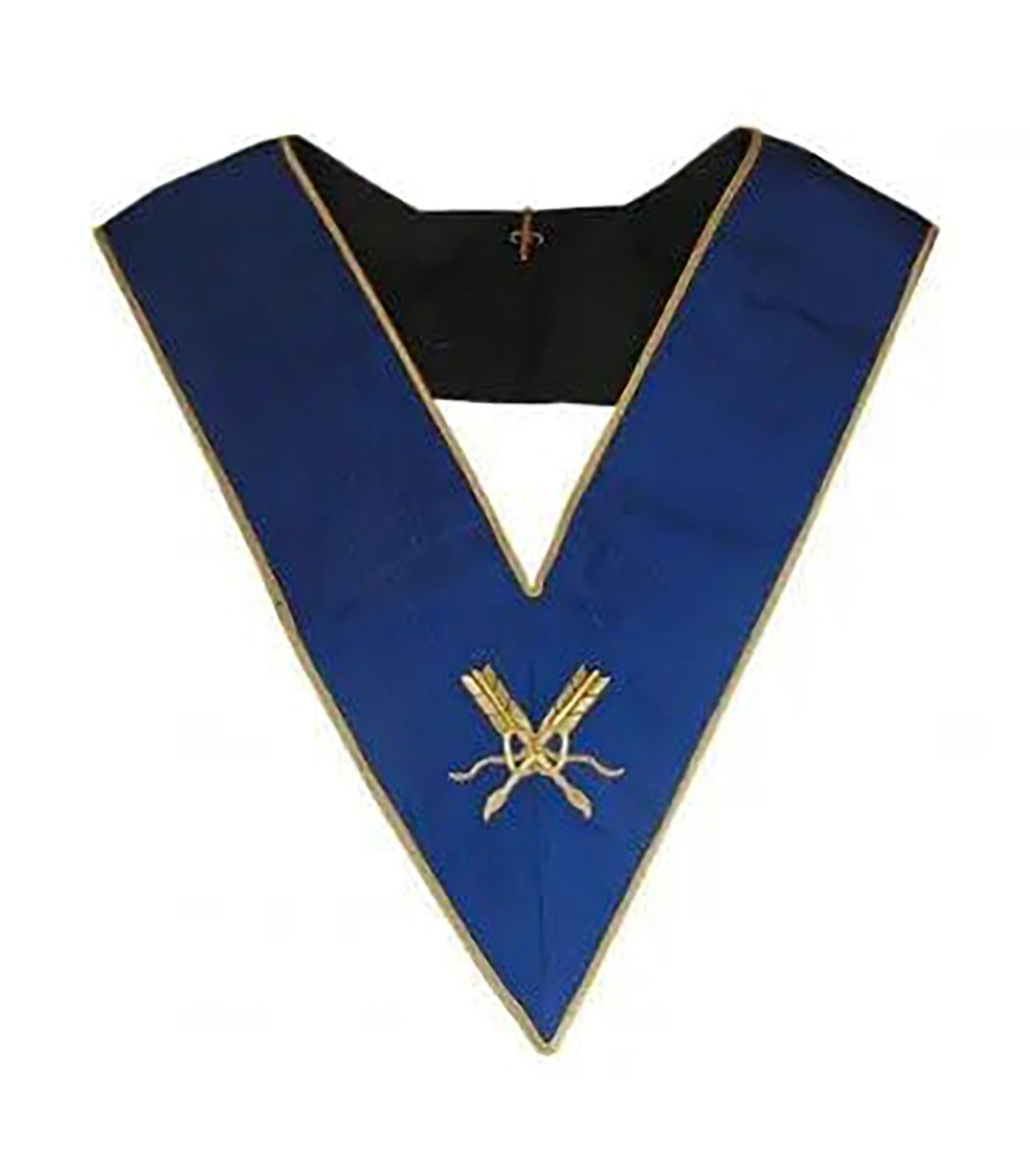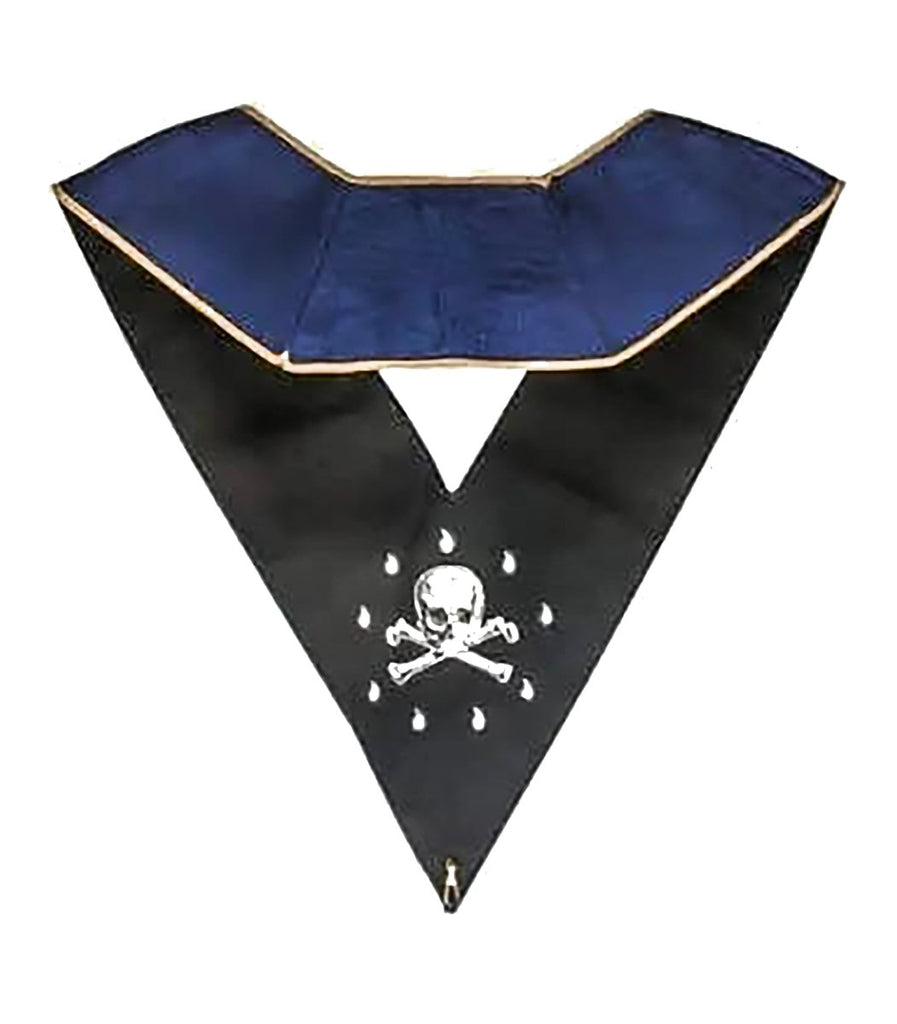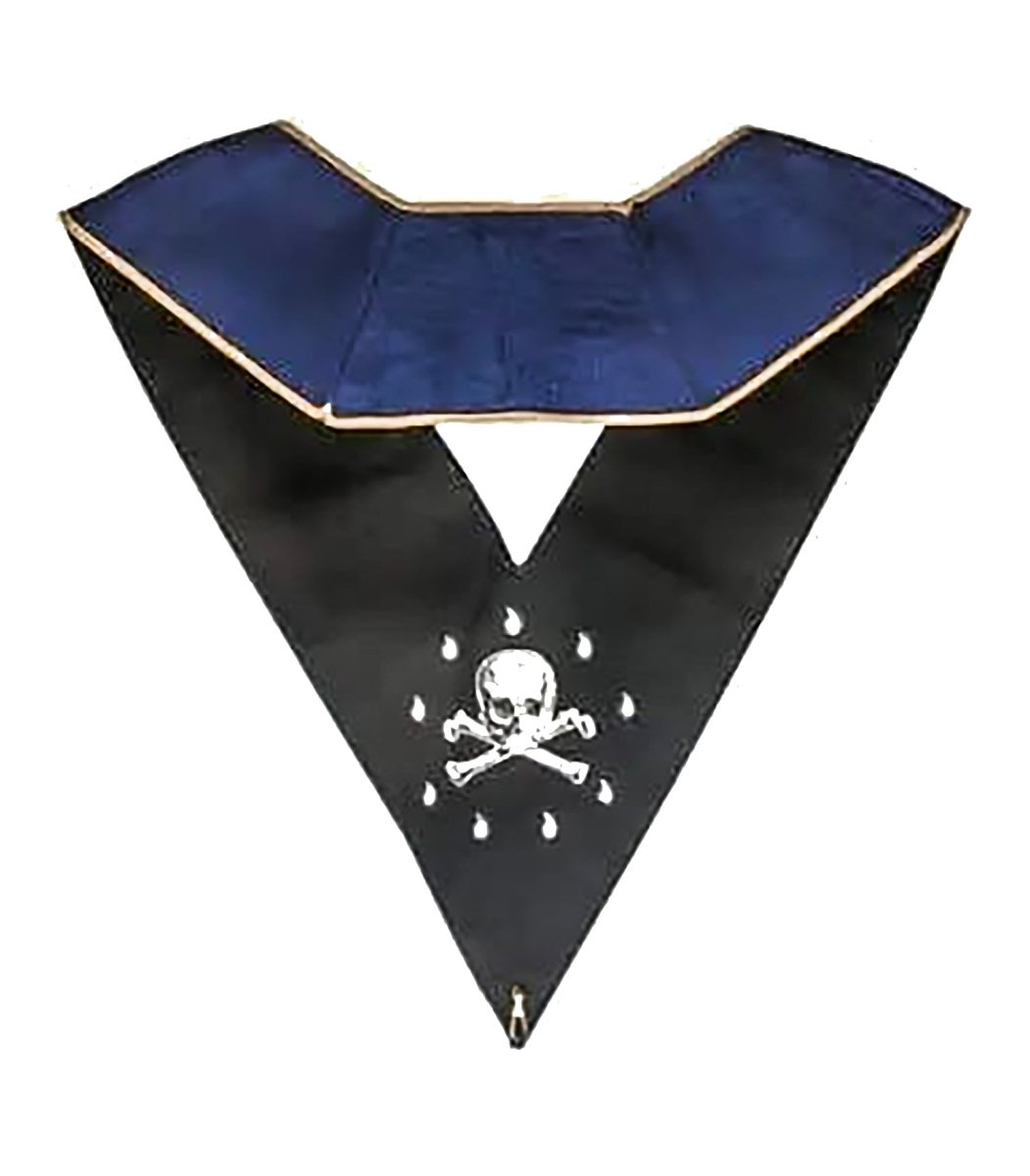 Excelente colar longo de Secretário em Outremer Blue Natural Silk, fronteira com uma manutenção dourada e adornada com o bordado do símbolo do escritório e um preto de costas com sua escolha uma impressão funerária.