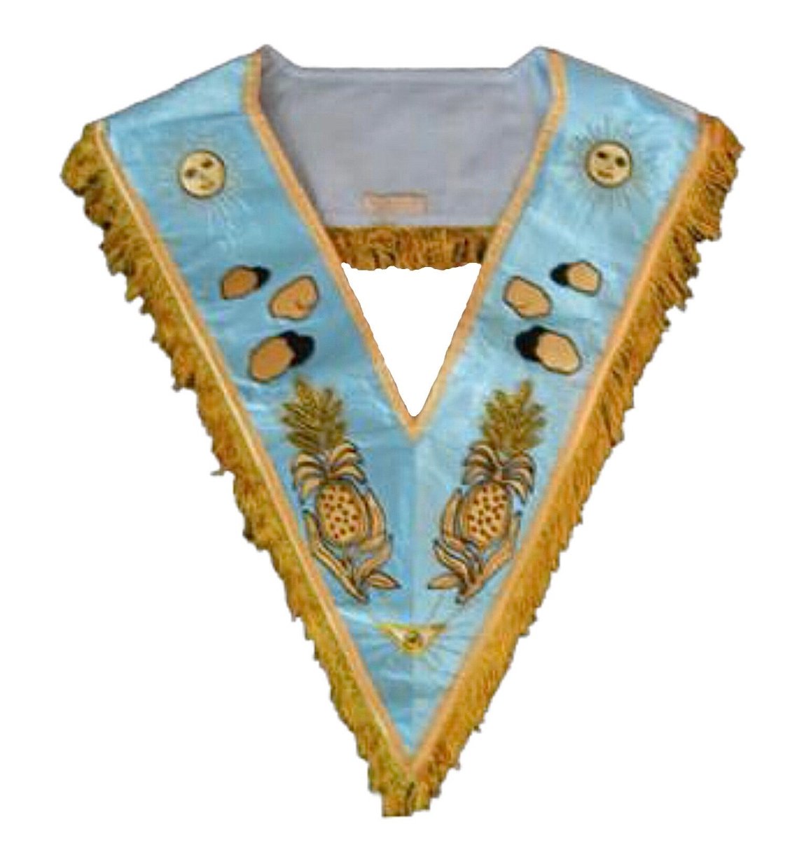 Sautoir de cérémonie de Grand Maître Provincial, en soie naturelle de couleur bleu ciel, bordé d’or et muni de franges d’or. Il est brodé à la main. Le dos bleu ciel est doublé pour un meilleur confort.