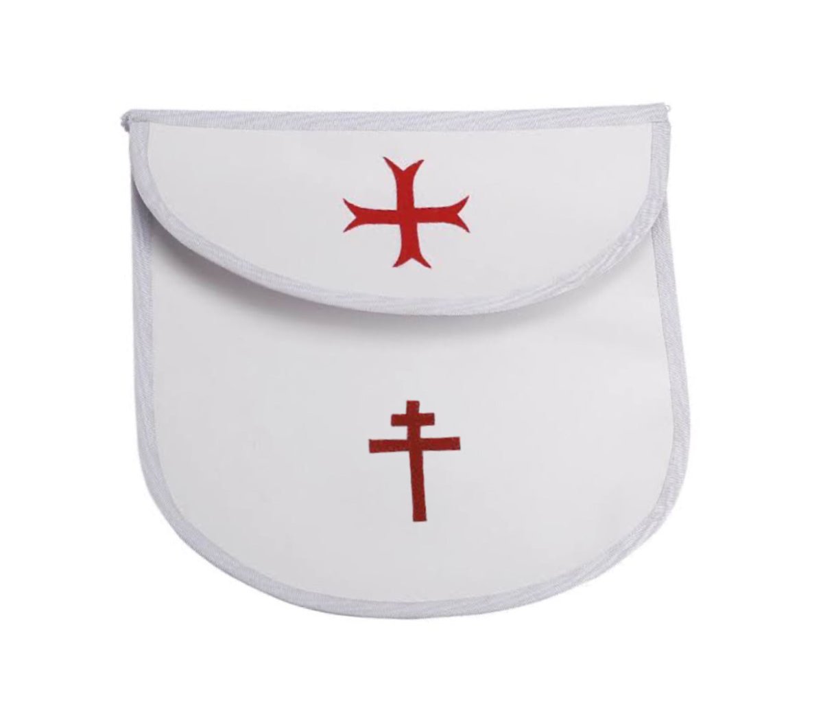 Avental de vigário maçónico em couro genuíno, debruado com uma fina fita branca, com bordos arredondados e babetes. O babete dobrável é decorado com uma cruz templária vermelha e o avental ostenta uma cruz de Lorena vermelha.